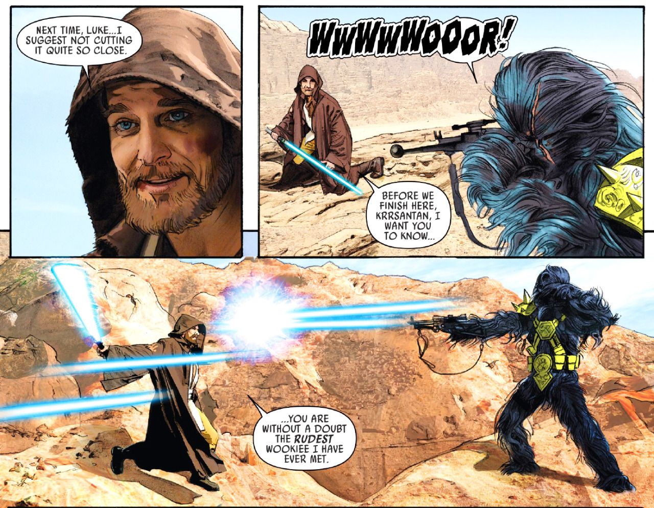 Black Krrsantan is a real badass motherfucker from the Star Wars comic books. He was banished from his homeworld of Kashyyyk when he was younger, famously baited slavers into taking him to a gladiator tournament that he was the king of for years, 'Thor: Ragnarok' style….