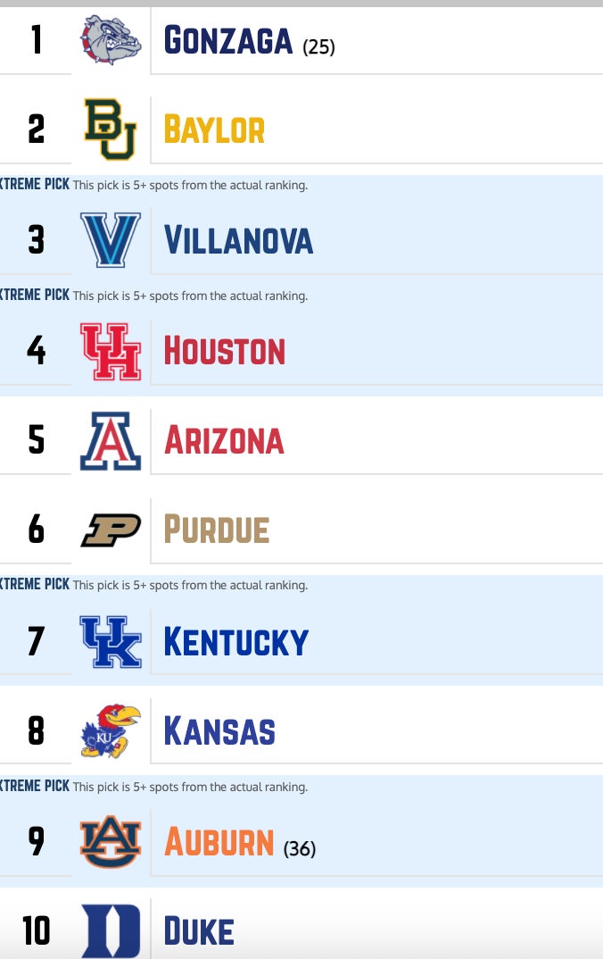 What are we doing here? I don't know if there can be an argument for having Auburn outside of the top-3 that truly makes a lot of sense. The only argument is 'KenPom has them 9th'. That's it. What makes even less sense is Newell had Auburn ranked 8th a week ago. So he dropped them for winning … at Alabama and Ole Miss? Two road wins in conference including against a top-20 team? That checks out.