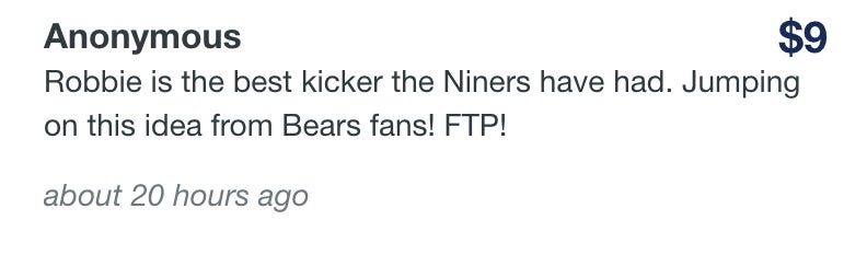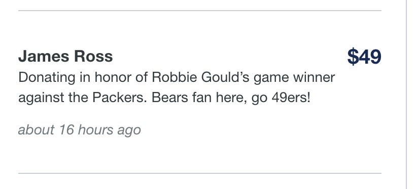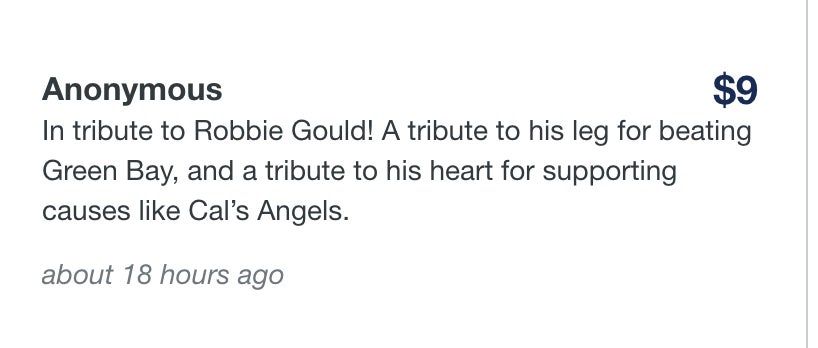 That is just a small sample of people stepping up and doing some good in the world just because they like a kicker and the result he got. Awesome story. We need more charity tied to things like this. Anyone who beats the Packers should get money donated to a cause of their choice. Let's set that up for all 17 weeks next year. Hopefully the Packers suck and we raise a bunch of money. If you'd like to donate to Cal's Angels you can click here