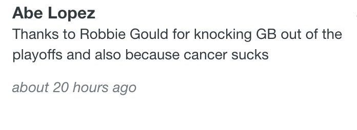 I think all of Chicago is still riding high from seeing the Packers go down in flames in playoffs...again. That clip of Jimmy G saying "you're a fucking legend, man. Fuck the Packers" warmed my heart. I could feel my heart growing like I was The Grinch. Robbie did well, and because of that...he's doing good. Robbie Gould is involved with a charity called "Cal's Angels" which supports families going through pediatric cancer. They do research. They grant wishes. They raise awareness. They are getting an influx of support from appreciative Bear fans across the internet