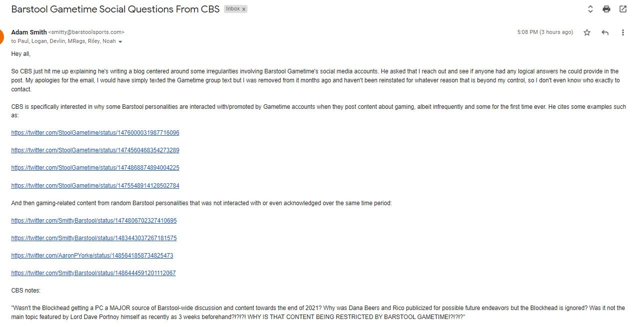 CBS is specifically interested in why some Barstool personalities are interacted with/promoted by Gametime accounts when they post content about gaming, albeit infrequently and some for the first time ever. He cites some examples such as: