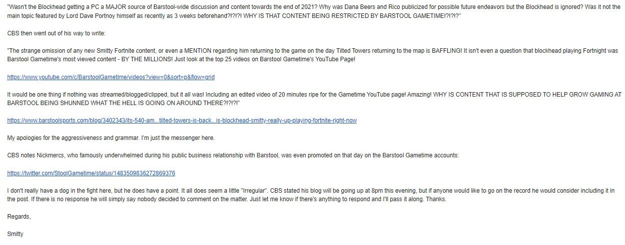 "Wasn't the Blockhead getting a PC a MAJOR source of Barstool-wide discussion and content towards the end of 2021? Why was Dana Beers and Rico publicized for possible future endeavors but the Blockhead is ignored? Was it not the main topic featured by Lord Dave Portnoy himself as recently as 3 weeks beforehand?!?!?! WHY IS THAT CONTENT BEING RESTRICTED BY BARSTOOL GAMETIME!?!?!?"