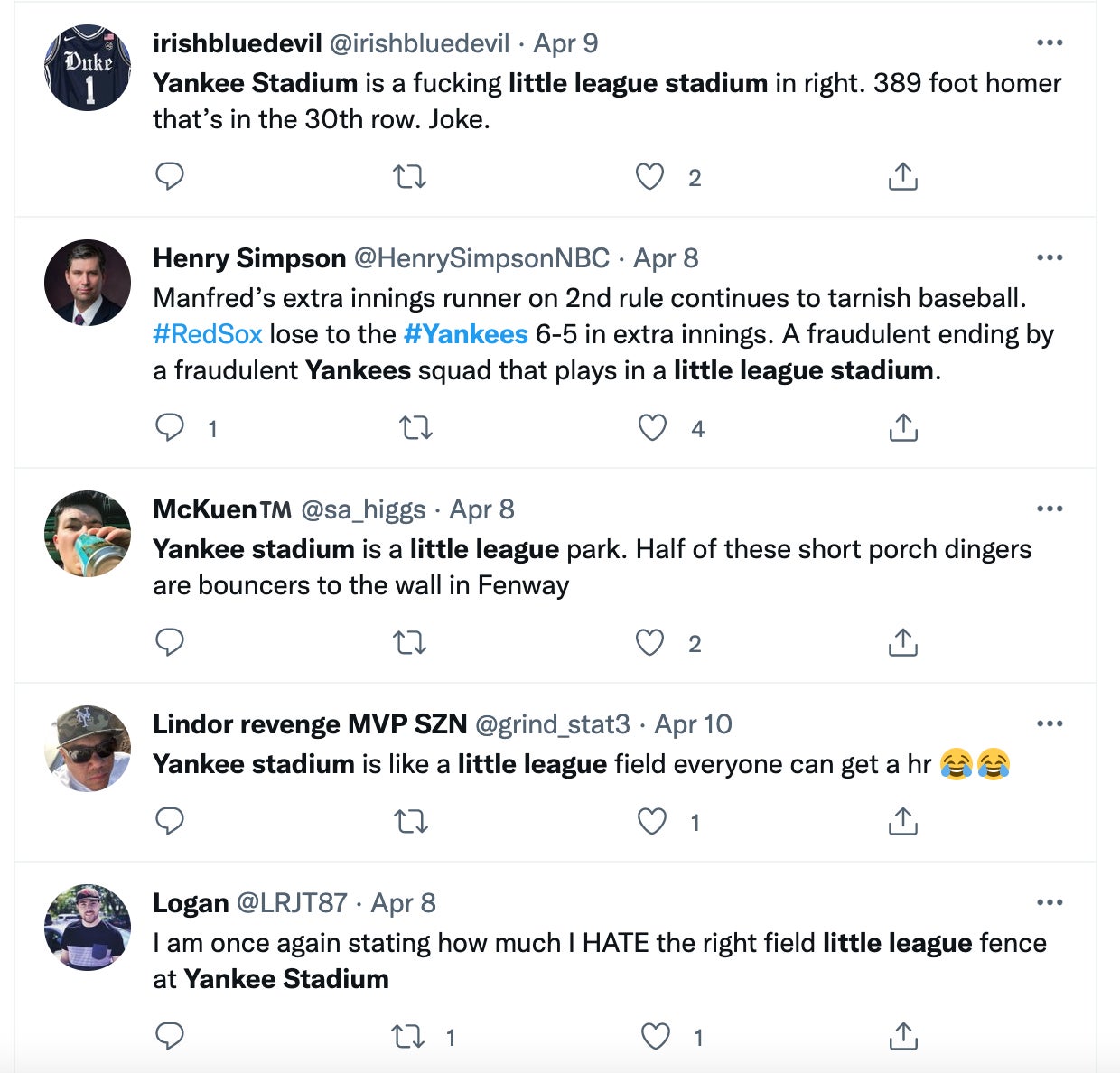 Baseball returned to Yankee Stadium this weekend which meant it was also the return of loser idiot cry babies complaining about how Yankee Stadium is a "Little League ballpark." The above screenshot is just a small snippet of the many many many tweets this weekend. And I've had enough of it.