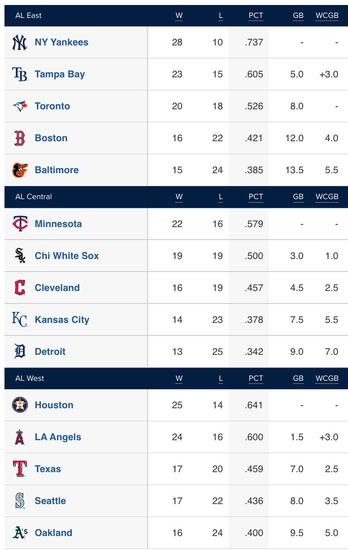 - The AL Central is interesting because the White Sox have been categorically terrible relative to expectations. I mean downright TERRIBLE. The lineup has been atrocious outside of Robert and Tim Anderson. The front office took some risks and they're getting killed for it now by the fans. This is the complete opposite of how White Sox fans wanted to start the season. Now it's getting hot out and you know the fists will be flying. Unique situation here as the stadium will draw huge crowds this summer, but will the team be worth the watch? For public safety purposes, let's hope so. Otherwise the Twins can keep building a lead that might not collapse as fast as people expect. Chris Paddack going down for the year doesn't help. Baseball would be better off if the White Sox reached their potential so let's stay positive and hope for that.