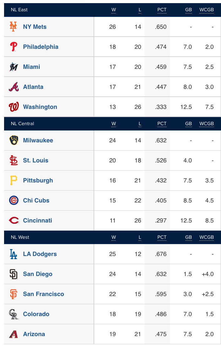 - Don't hit the panic button in Atlanta just yet. The Mets have been so hot and now they're down another Ace. Sucks to get two of them and they both get hurt. To me the Phillies still need to pitch and catch it to be a real threat and Miami could be the one to make the August run. Somebody always does. But for now the Mets are in control with an extremely balanced lineup. I think this division is subject to the most change 2-4 than any of the other divisions the remainder of the year.