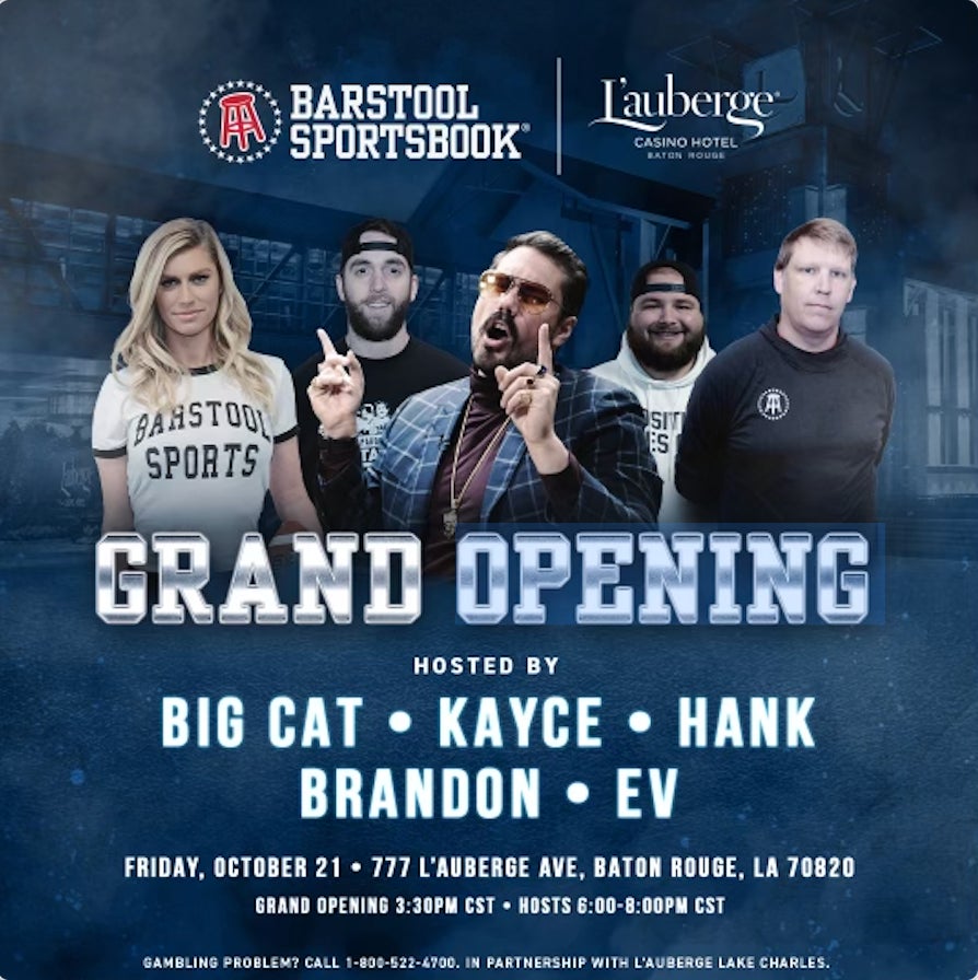 Dan, Brandon, Hank, Ev and I (+ other Barstool guys) are flying down to Louisiana on Friday to open the brand new state-of-the-art Barstool Sportsbook at L'Auberge Baton Rouge.ย