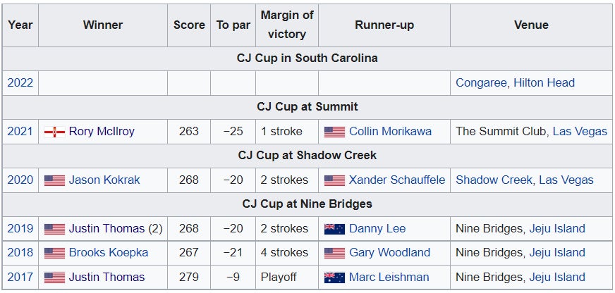 Last year's leaderboards (both at the CJ Cup and at Congaree) and recent winners…