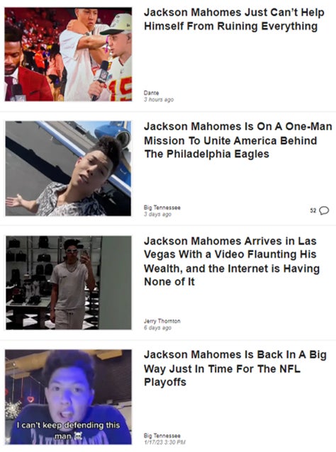 Don't get me wrong. I do not care for Jackson Mahomes. I dislike the guy as much any other red-blooded American. His content is unsettling, and his TikTok videos feel like personal attacks. You could make a sound argument that he deserves to be locked away in a maximum security prison. Unfortunately, nothing he's doing is "technically illegal", so I'm afraid that Jackson Mahomes is here to stay. As long as Patrick Mahomes is relevant (which will be until long after I'm dead), his viral sensation of a younger brother will be a part of our lives. The kid moves the needle. All 4 of these blogs were written within the last month, and each one of them was at one point the #1 blog at the top of Barstool Sports' website.