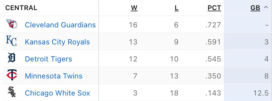 3. The Guardians have played the Twins, White Sox, and A's 12x in their first 22 games.