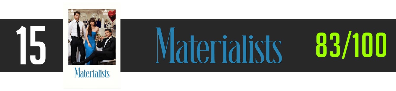 A clear step down from 'Past Lives', there are issues that really plague 'Materlialists' from working, but there's no doubt Celine Song is one of the best active writers in Hollywood. Going for a collision of romcom and romantic drama was an admirable swing, even if it doesn't fully work.