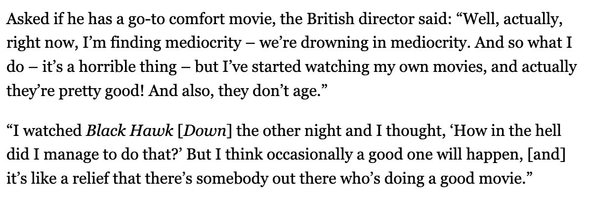 I mean, to his credit, 'Black Hawk Down' fucking rocks. As does 'Alien' and 'Blade Runner' and 'Gladiator' and I'll even give ya 'The Martian' and 'Prometheus' as far as more recent hits. It is a bit tough to say that the movies are "drowning in mediocrity" while he's making stuff like 'Napoleon' and 'Gladiator II' however. And I admittedly didn't see either one of those movies, but only because I heard from so many people that did and said they were pretty bad.