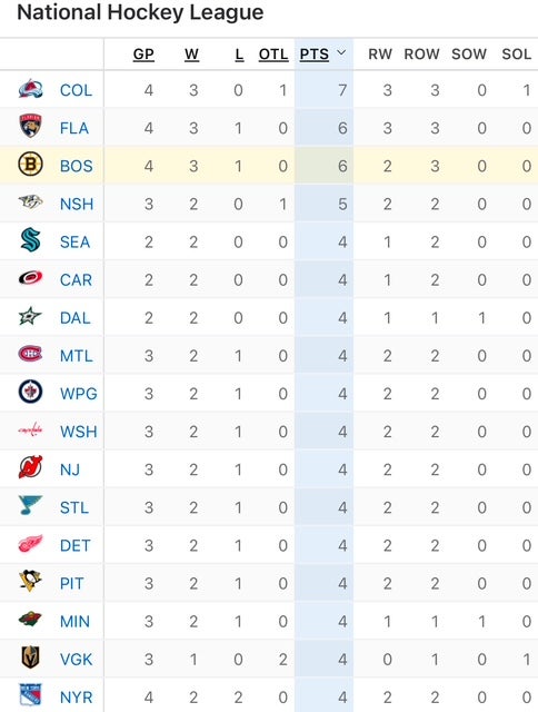 Their #1 goalie Jeremy Swayman was in training camp this year and he's been stellar in both of his starts thus far: 2-0-0, 1.00, and .966. Elias Lindholm looks more like the guy the Bruins were expecting after signing him to a free agent deal 15 months ago, potting two power play goals and adding a pair of helpers in four games. Superstar forward David Pastrnak has 1-4--5 in four games and looks like he could even play a little goalie as well.