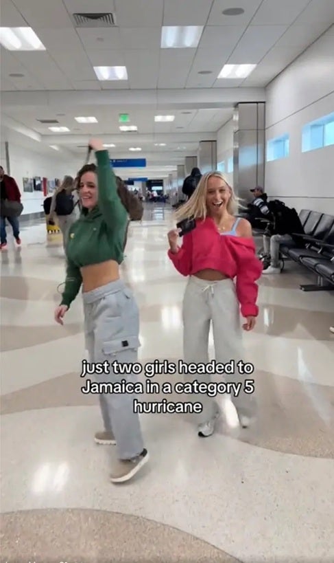 “Just two girls headed to Jamaica in a Category 5 hurricane,” she gloated alongside another clip of her strolling through the airport.