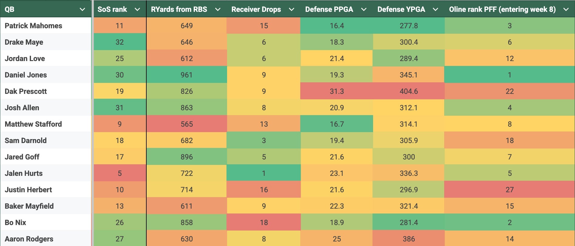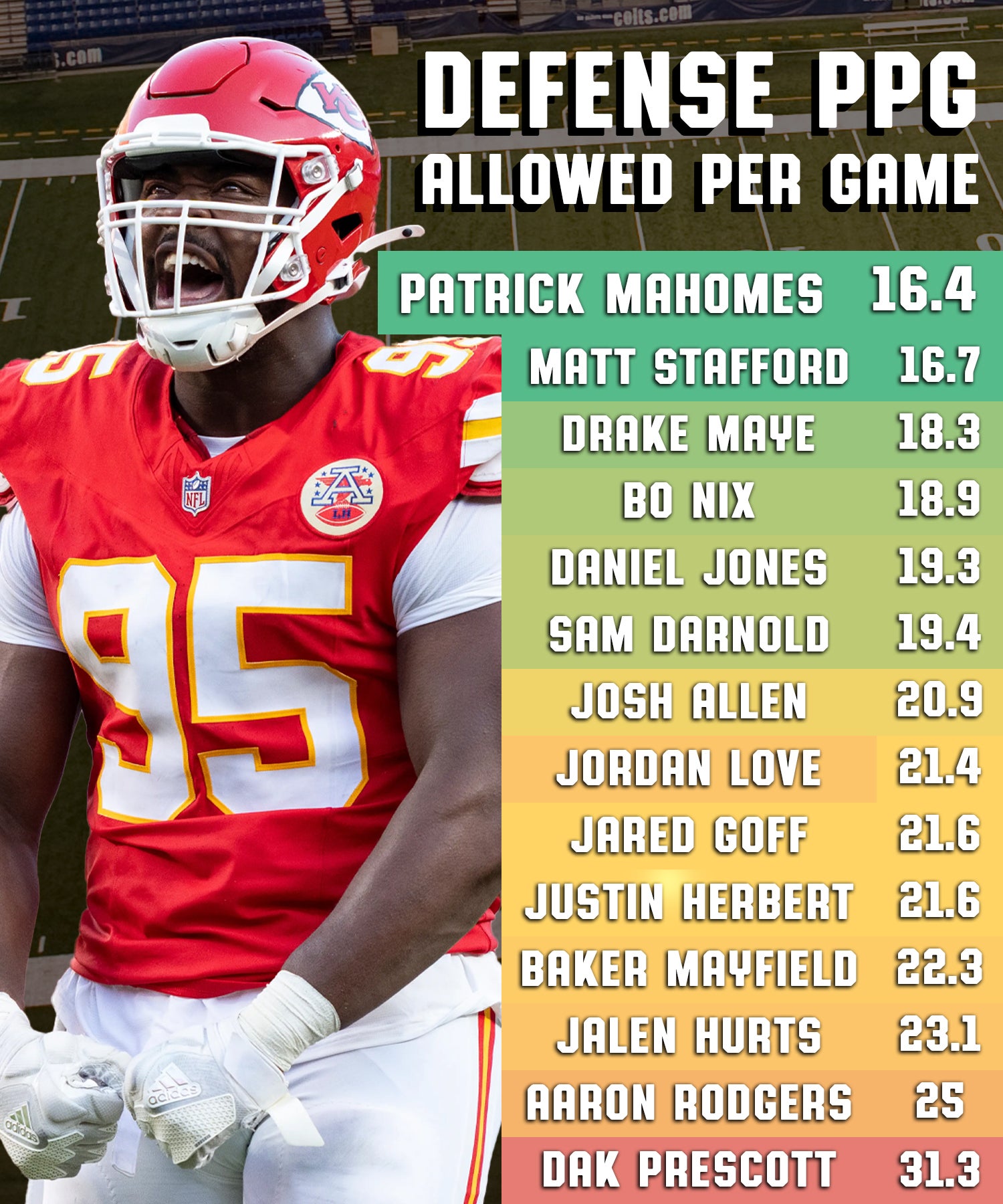 Lastly, the defense. Bad defense can ruin even the most electric offense. Spags, once again, is leading a top unit but I'm mostly impressed with the Rams. They features some young guys and were very middle of the road last year but they have turned into a legit force. Second fewest PPGA and vs the 9th hardest schedule in football. No easy task! The glaring QB being fucked the most here is Dak Prescott. My god could they use a defensive superstar to shore up that defense.