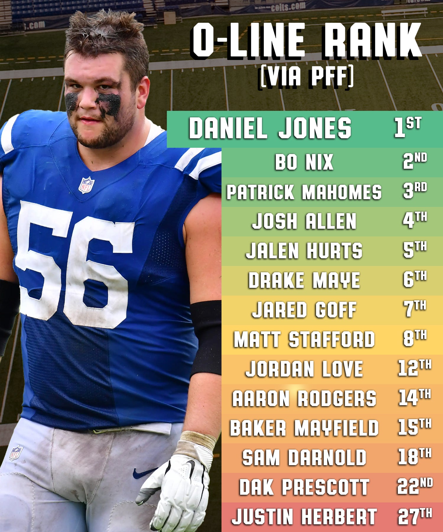 Again, top dogs here haven't had much movement over the last few years. The Colts are finally blocking for a good QB so they are shining like they used to. The Broncos are still making Nix look like a good QB and the Chiefs, despite all the bitching and moaning from their fans, still have a good unit anchored by the best center in the league. Similar to the RBs, they still share a symbiotic relationship with the QB. QB holds it too long, RB can't find the hole and they can end up looking bad. I still say prayers every day in all religions (Shoutout Steve Michalik) for Justin Herbert, who is being blocked by the worst Center in football and multiple dudes signed off the street.