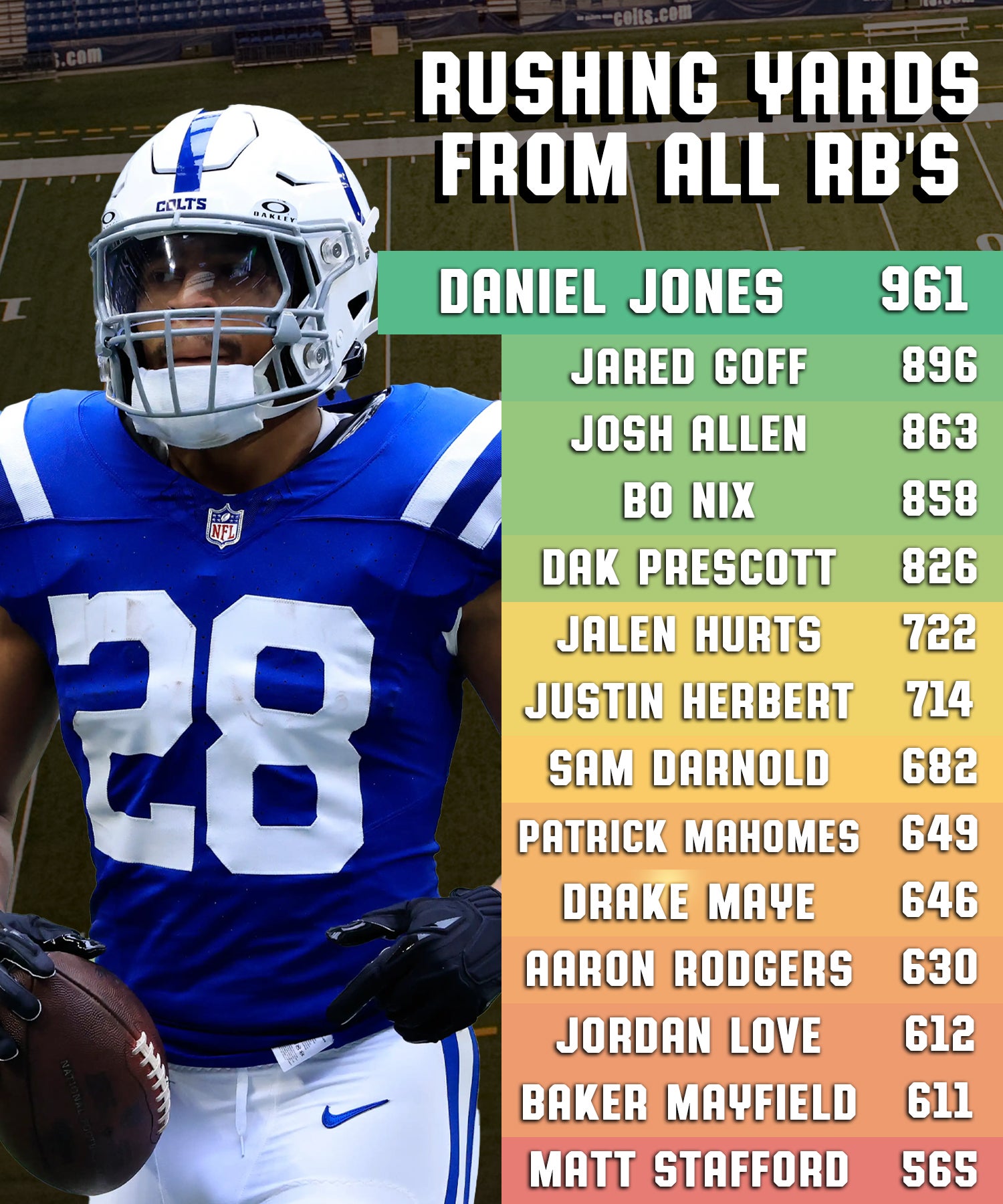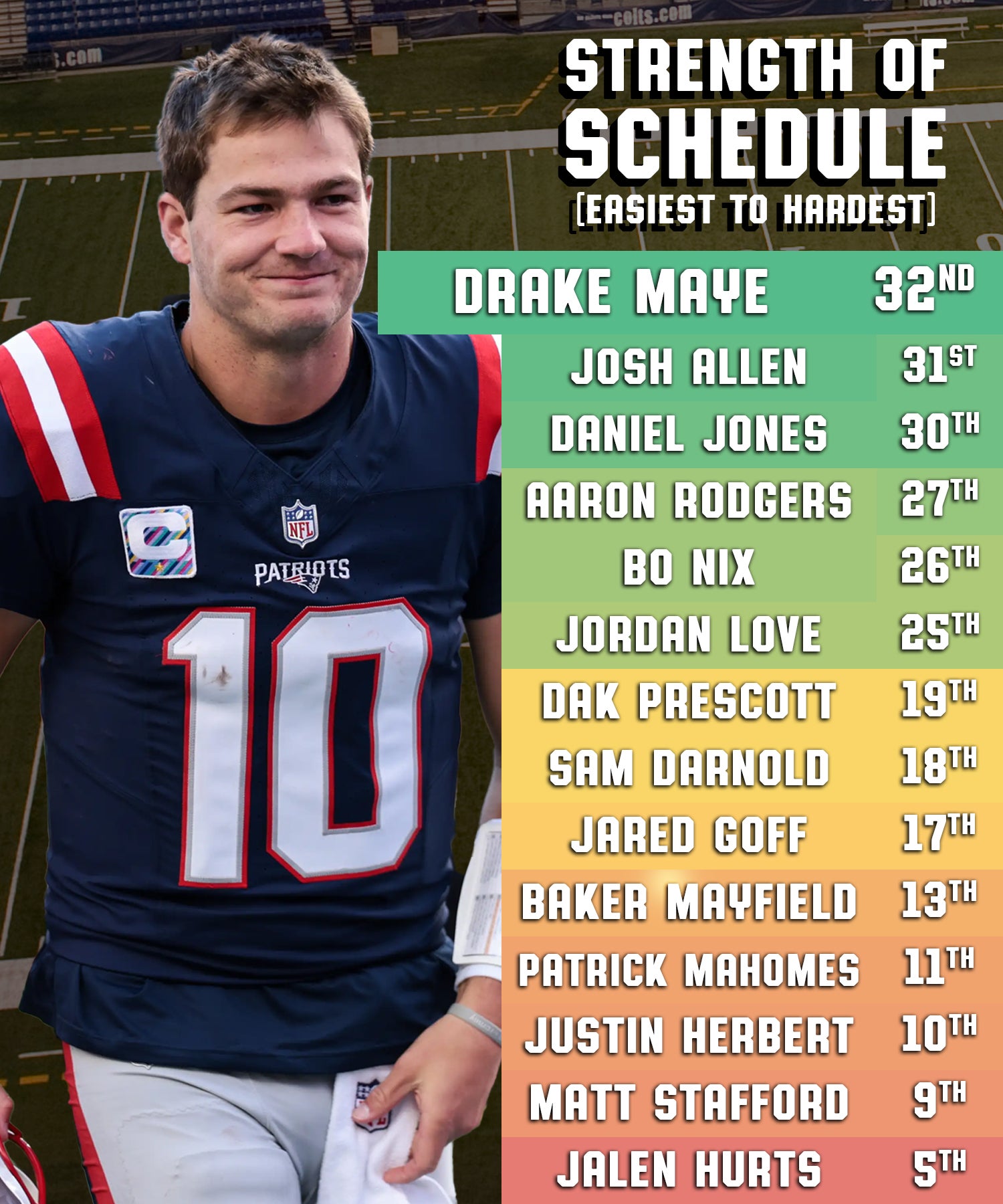 Maye, IS playing out of his mind but it happens to be against the easiest schedule in football SO FAR. To be very clear, this is a good thing. You can only play the team in front of you, after all. And the schedule being easy is no guarantee of good QB play. Just ask the Vikings, who played the 4th easiest schedule this year but have sucked ass. Similarly, Josh Allen has had it easy this year and it won't get much harder. The Bills travel the second fewest miles this year and only leave the Eastern Time Zone twice this season (for reference, the Rams will travel across 44 time zones in 2025). Lastly, Daniel Jones has also had it fairly easy. They've played 3 playoff teams from last season, narrowly beating Denver, losing to the Rams and smoking an injury depleted, piss jersey-wearing Chargers. The other teams they've played have a combined 7 wins.
