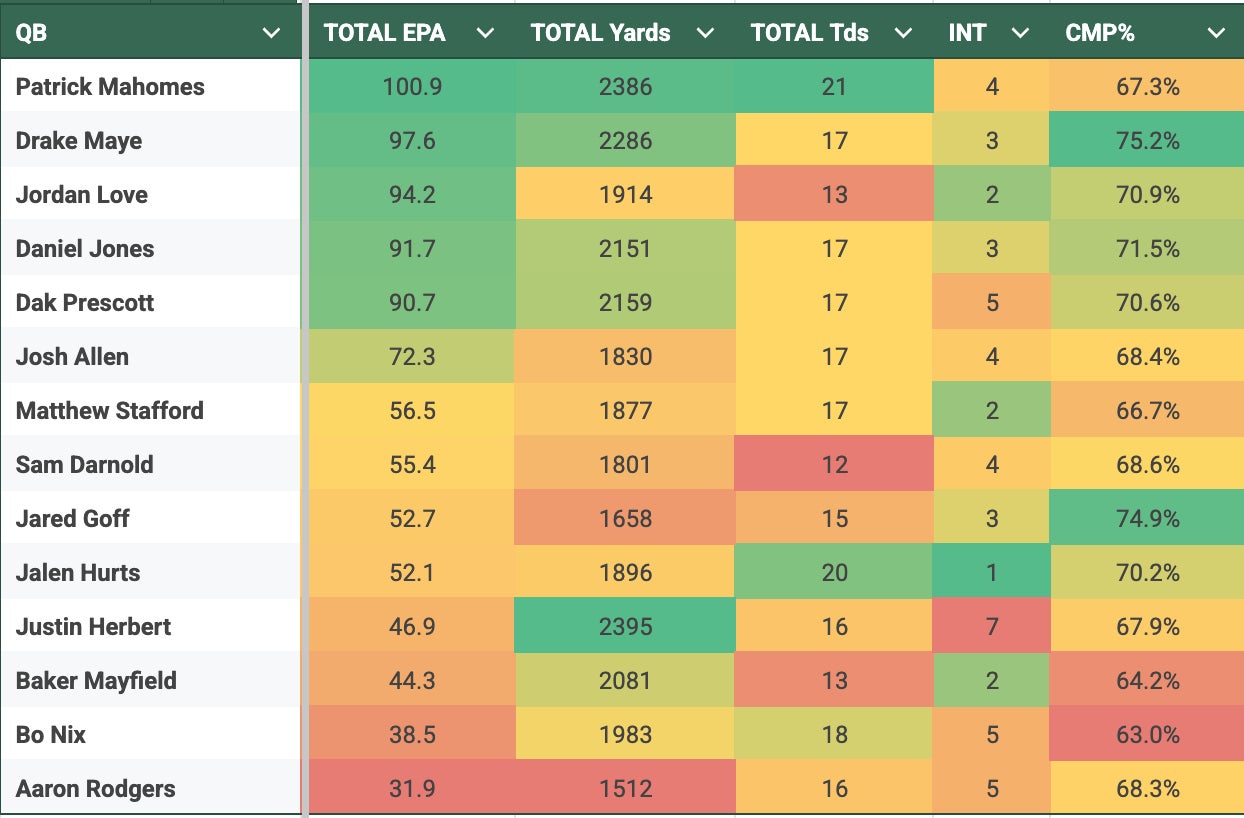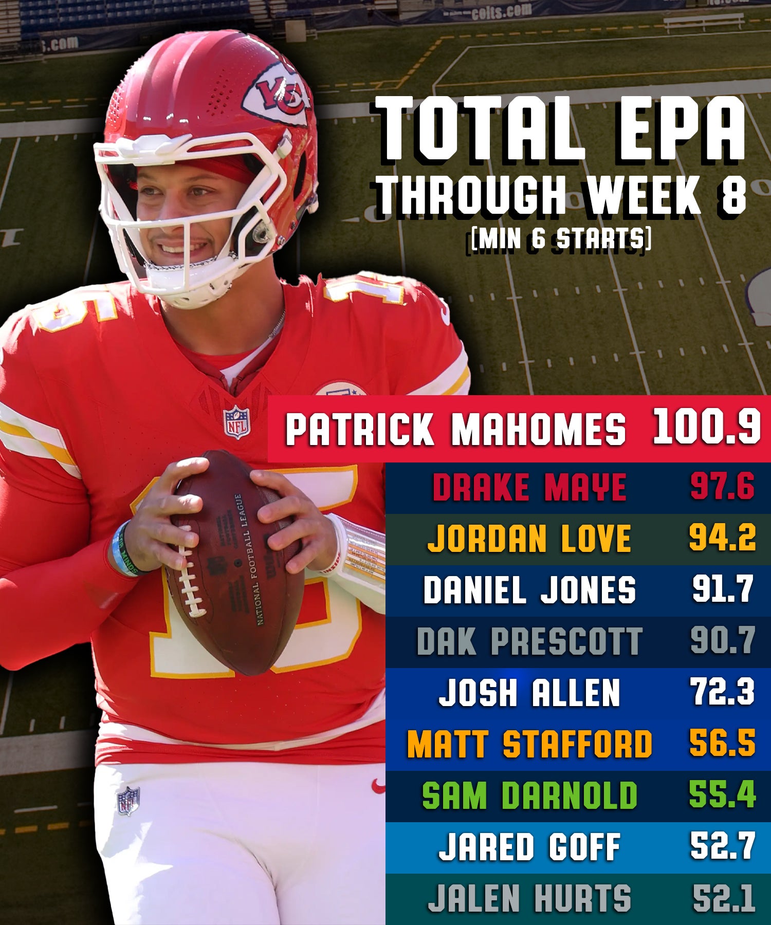 Let's start out with the most simple numbers of all. Who is playing the best in a bubble? The answer to that is also simple: Patrick Mahomes. He may not be jumping off the page like the turbo offense days, but they're finding ways to get it down after a slow start. And when you consider what his receiving room has looked like for most of the year and the lack of a run game, it only makes it more impressive. Right after him is Drake Maye, who has emerged as the 2025 gunslinger of the year.