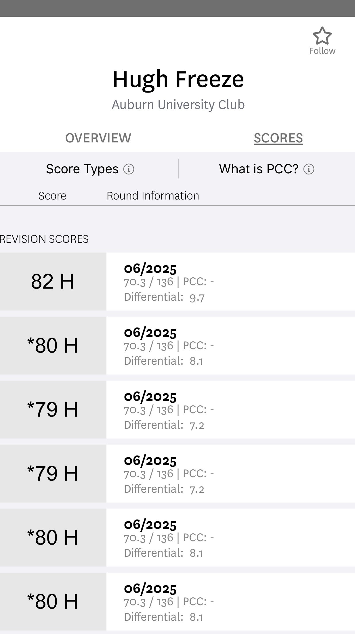 Another message board poster noticed Freeze had played golf in 10 of the first 20 days of June through his public USGA scorecard. Freeze hasn't posted a score publicly to his GHIN since.
