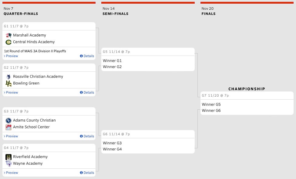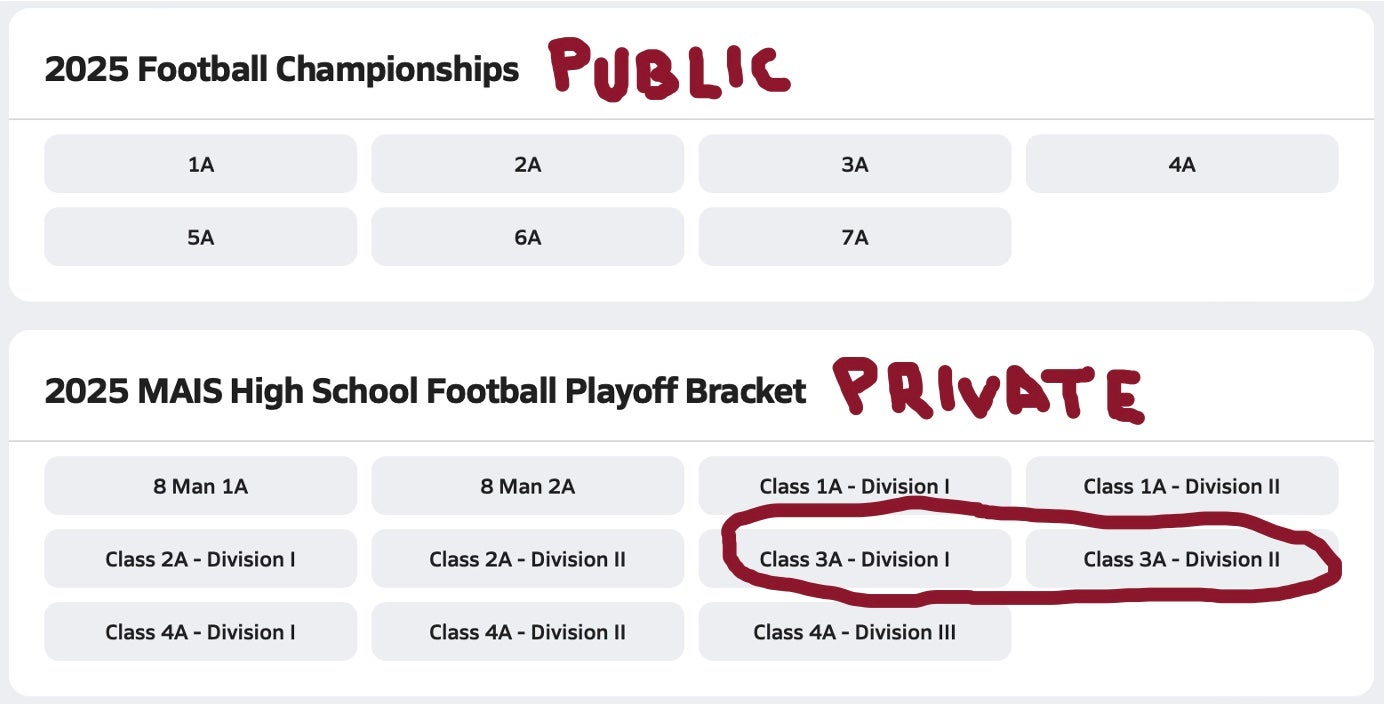For some reason, within MAIS Class 3A, Mississippi has decided they will have 2 state champions (Division 1 & Division 2). But the divisions aren't decided at the start of the season. At the end of the regular season, the MAIS Class 3A teams ranked 1-4 play for the Division 1 State Championship.