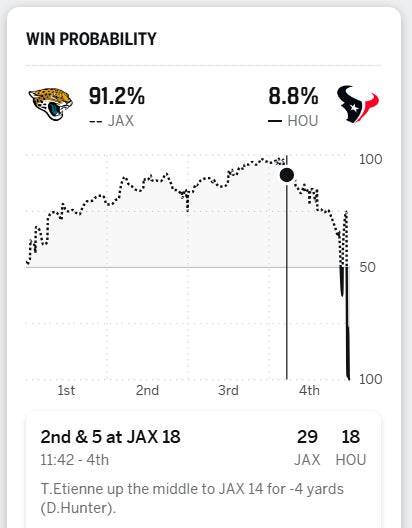 The Jaguars had a 98.9% chance to win the game with 13:35 remaining in the 4th. Not only did they lose, but they also failed to cover. They ran nine plays in the 4th quarter and netted ONE yard, going punt, punt, and that fumble to end the game.